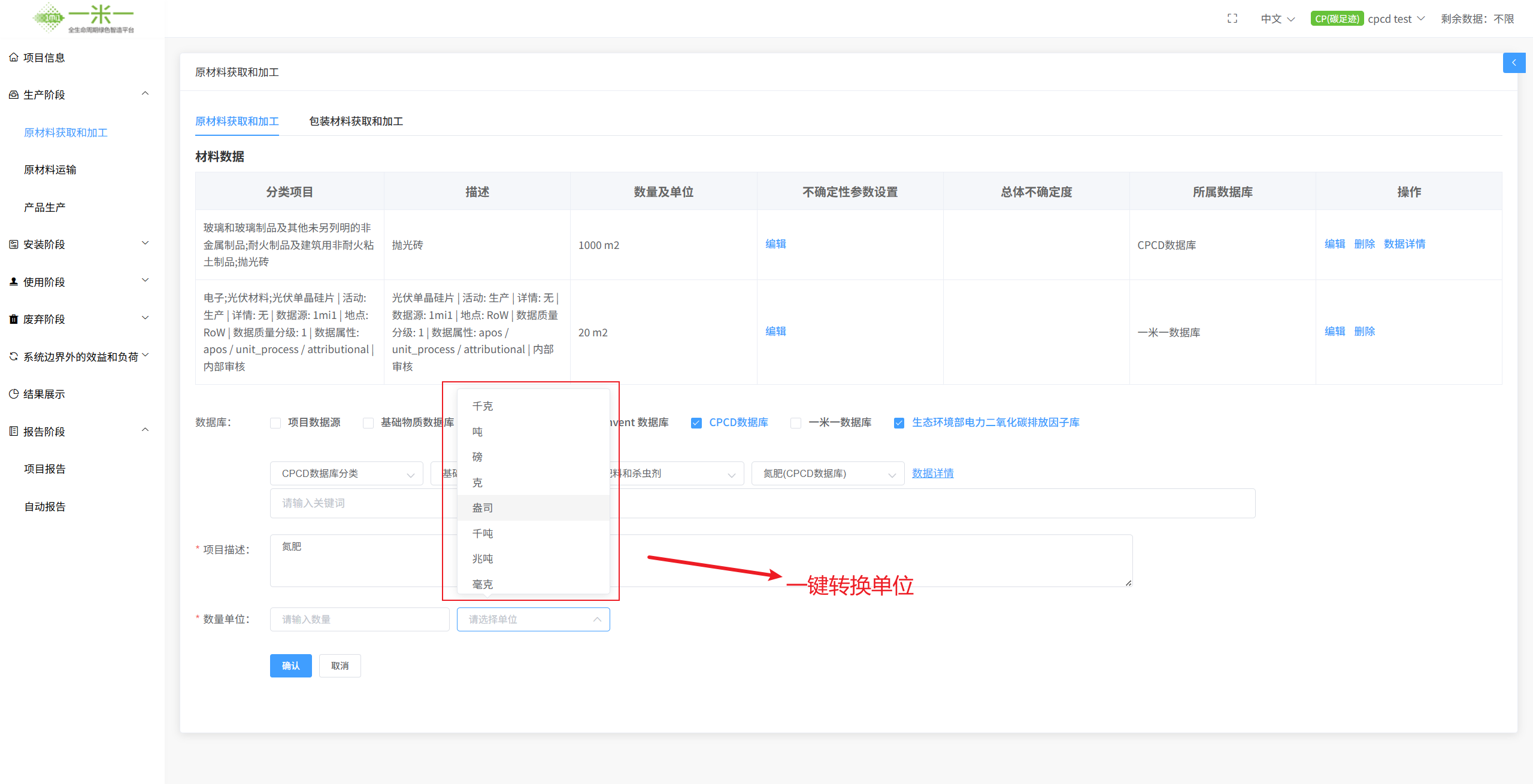 打破孤岛,多库合一: 在其他软件中,您可能需要分别导入 Ecoinvent、CPCD 或其他库文件。 而在一米一,我们实现了“多库聚合”。